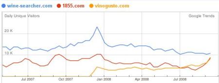 Este mes de septiembre me parece que Vinogusto (portal en el que participo) se ha convertido en la tercera web de vinos con más visitas del mundo, poco detrás de wine-searcher.com y 1855.com. Desde su lanzamiento en 2007 Vinogusto ha crecido, mes a mes, hasta alcanzar y adelantar uno a uno casi todos los demás portales de mayor antigüedad.